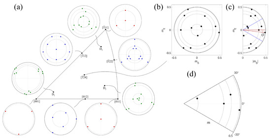 These maps also allow for a quick inspection of the stress state in each partial, a description preferred by some authors [17,19]. The Burgers vectors of the leading and trailing partials were initially chosen to point at and from the x-axis, and these constraints are preserved in the stress orientation maps. The Schmid factors of the partials that compose each perfect dislocation, and , are the projections onto axes that point at these angles. Note that the lines joining the point with the highest Schmid factor and the two coplanar slip directions have in the orientation map slopes of , as they share the same partials. Similarly, the polar coordinates (with radius m and angle ) for each slip system can be easily observed; this description is also widely used in the literature [20,21,22]. Table 1 contains the conversion formulae between the variables from different nomenclatures.