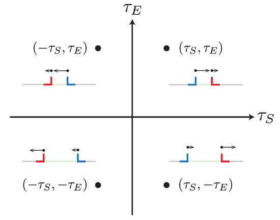 Compare now the first stress state proposed with that which arises upon loading reversal, i.e., , from Figure 3. In this case, both the direction of motion of the dislocation and the effect of the Escaig stress on the stacking fault width are reverted. This effect most likely has an effect during cyclic loading, as it implies that partials will glide with a different separation during, for instance, tensile and compressive stages; one of them is more likely to cross slip. Graphically, a stress reversal results in a point inversion around the origin. Thus, it can immediately be seen that the deformation behaviour of crystals loaded in tension along a or direction will resemble that of one compressed along a axis.
