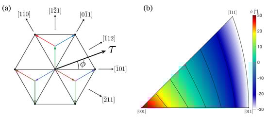 Physically, an angle favours glide of the same leading partial in two coplanar slip systems and appears on the plane with the highest shear stress during tensile loading along an orientation on the line from to or upon compression. Alternatively, results in a higher Schmid factor for the trailing partial also on two coplanar slip systems. The transition when moving away from a axis occurs as the stress state on the slip plane rotates between two consecutive directions because of the specific routes the atoms must take in order to generate an intrinsic stacking fault, illustrated in Figure 4a. This fundamental difference between the two types of directions in an fcc crystal must be incorporated into any type of mechanistic modelling driven by Shockley partials, but is often ignored [23,24]. Figure 4b shows the value of for the slip plane with the highest Schmid factor for all possible uniaxial tensile loading orientations. This angle is then a more intuitive parameter than others found in the literature to account for the stress orientation on an octahedral plane.