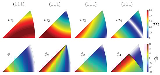 The previous description can also be extended to the four slip planes; the corresponding values and angles are plotted in Figure 5. This clearly shows that the shear stress on the different slip planes may have different effects under some loading orientations, possibly promoting different mechanisms. Together with the stress orientation maps, this description may be used to determine the effects of stress orientation on the microscopic dislocation behaviour and the macroscopic deformation response.
