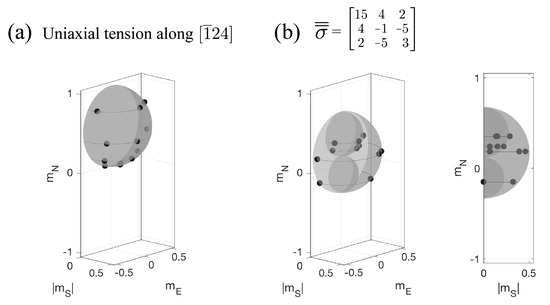 Incorporating the stress normal to the slip plane , in the form of a normal factor , requires adding an extra dimension to the stress orientation maps. This makes the analysis less intuitive, but it may be necessary for studying phenomena where this stress plays an important role. A relation between the attainable shear and normal stresses already exists in the form of Mohr’s circles, which may be extended to include the decomposition of the former into the Schmid and Escaig components. Analogous Mohr’s spheres that intersect the axis at the eigenvalues of the stress tensor delimit the region where the stresses of the multiple slip systems can be located, either on their surfaces or in the space in-between them, while the aforementioned two-dimensional geometrical constraints are preserved in the orthogonal axes. Figure 6a,b show this geometrical representations for cases where two principal stresses have the same value and where all of them are different, respectively. The stress tensors are initially normalised by the difference between the maximum and minimum principal stresses to match the nomenclature used so far.