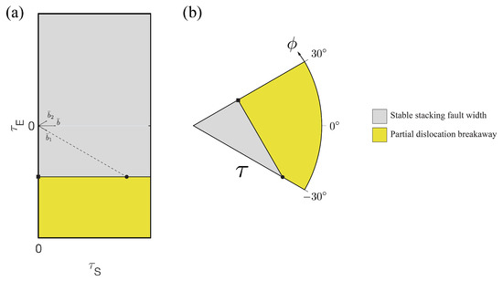 Consider two dissociated dislocations with stress states at points and , as those in Figure 3. A negative Schmid stress reverses the direction of motion of a dislocation and swaps the leading with the trailing partial, but leaves the stacking fault width unchanged. Thus, a map with the absolute value is sufficient to represent the behaviour of the 12 slip systems, as shown in Figure 2b,c.