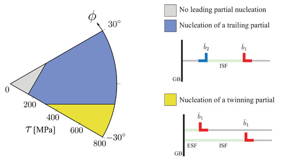 Orientation dependence of the Copley-Kear-Byun partial dislocation breakaway mechanism [7,36] for the extension of a stacking fault as a twin nucleus. (a) Schematic plot with aspect ratio 1:1 of the stress orientations where each regime would appear and (b) reduced map within the domain of . Two points are marked before and after reflecting the boundary along the −30 axis indicated by the dashed line.