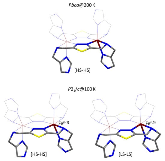 For one complex cation in the asymmetric unit, the iron(II) ion (FeHS) stays in the HS state. The average Fe-N bond length of 2.184 Å and the octahedral distortion ∑ of 115.6° remain almost the same as in the structure obtained at 200 K (2.187 Å and 116.3°), confirming a localized [HS-HS] dimer. For the other complex cation, the average Fe-N bond lengths and the octahedral distortion parameter ∑ for the iron(II) ion (FeLS) decrease to 2.008 Å and 69.5°, which accounts for a localized [LS-LS] complex cation. Thus, a spin transition occurs between 200 and 100 K from the [HS-HS] to the mixed [HS/LS] state, which is a 1:1 mixture of localized dimers either in the [HS-HS] or in the [LS-LS] state (Figure 3). The crystallographic differentiation, whether the [HS-LS] state is realized by discrete [HS-LS] molecules or it composes from a 1:1 mixture of [HS-HS] and [LS-LS] molecules, is not possible in most cases due to higher symmetry in the space group. In centrosymmetric molecular structures, a superposition of the HS and LS iron(II) ions might be observed [,,,,,,]. Fortunately, this is not the case for C3, where at low temperatures the dimeric spin crossover complexes can be clearly identified as either [HS-HS] or [LS-LS] molecules.