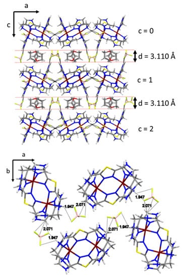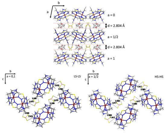 Along the crystallographic c-axis in C3·THF (@200 K), the dinuclear [HS-HS] molecules are arranged in two-dimensional layers formed by hydrogen bonds between the amine protons and the fluorine atoms of the tetrafluoroborate ions (Figure 4, bottom). These layers are separated by 3.11 Å and non-coordinating tetrahydrofuran solvent molecules, as well as tetrafluoroborate counterions which are located between the layers (Figure 4, top). However, there is no cooperative interaction pathway via hydrogen bonding between the two layers. When lowering the temperature, the occurring SCO phenomenon, ([HS-HS]→[HS-LS]) is accompanied by a phase transition and the space group changes from Pbca to P21/c. At low temperatures, the complex cations in every second layer are switched to the [LS-LS] state, resulting in alternating layers of either [LS-LS] or [HS-HS] molecules. This layered arrangement of molecules solely in the HS or in the LS is rare and we found only a few examples in the literature for which the spin crossover is accompanied by shrinking or expanding of one distinguished crystallographic axis [,,,,,]. Note that although the direction of the stacking does not change, the crystallographic c-axis of the high-temperature space group Pbca turns to be the a-axis in P21/c (Figure 4 and Figure 5). While the intramolecular bond lengths and angles for the iron(II) centers change significantly when going from the HS to the LS state, the intermolecular hydrogen bridges between the dimers in each layer do not change significantly. Thus, to give way to the overall reduced required space for [LS-LS] dimers, compared to the [HS-HS] ones, the stacking changes. With the SCO the interlayer diameter reduces by 0.3 Å from 3.110 Å to 2.804 Å. This drastic impact of the phase transition on only one of the crystallographic axes results inevitably to the small cracks in the crystal.