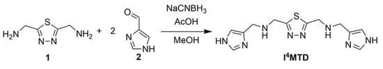 The synthesis of the precursor molecule 2,5-bis(aminomethyl)-1,3,4-thiadiazole (1) was previously reported by us []. The ligand (I4MTD = 2,5-bis{[(1H-imidazol-4-ylmethyl)amino]methyl}-1,3,4-thiadiazole) was synthesized according to a published reductive amination [] by reacting 1 with 1H-imidazole-4-carbaldehyde (2) followed by an in situ reduction of the formed imine to the respective amine with sodium cyanoborohydride. The reaction scheme for the synthesis of the ligand (I4MTD) is shown in Scheme 1.