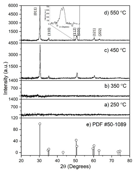 The phase composition of the synthetized ZrO2 thin films was characterized by XRD. Figure 1 exhibits the X-ray diffraction (XRD) patterns of ZrO2 thin films deposited on corning 2947 substrates at equal growth times, but at different annealing temperatures (Ta). The XRD patterns of the films sintered at Ta = 250 °C, 350 °C, 450 °C, and 550 °C are shown in Figure 1a–d. At the bottom of Figure 1e, the diffraction file of ZrO2 (PDF #50-1089) is plotted. For the high Ta values, the samples present only the tetragonal crystalline phase of ZrO2 [26]. The diffractograms of the film deposited at Ta = 250 °C and 350 °C exhibit a signal associated with an amorphous material. The patterns of the films deposited at 450 °C and 550 °C show both a peak with the higher intensity at 30.29°, corresponding to the (011) plane of the baddeleyite structure. These films grow with the (011) as preferred orientation. The presence of the reflection peaks at 35.28°, 50.42°, 50.75°, 60.26°, and 63.02° correspond to the (110), (112), (020), (121), and (202) planes of this same phase, respectively. The presence of some reflections from other phases are not observed. From the XRD patterns, it can be deduced that the as-deposited ZrO2 thin films remain amorphous until Ta < 350 °C. However, other authors have observed that by adding a low concentration of sulfur the crystallinity arises even at Ta as low as 200 °C, stabilizing predominantly the tetragonal phase [27]. Garvie found that the tetragonal phase stabilization in ZrO2 can be attributed to crystal-size effects [28]. The increasing sharpness of the XRD peaks with increasing temperatures indicates the gradual ripening of the ZrO2, phase, and gradual growth of tetragonal ZrO2 crystallites. These results are in agreement with those of Cassir et al. [29], and Li and Su [30], who obtained non-crystallized deposits close to 250 °C and 350 °C, as well as Lin et al. [31] and Lin et al. [32], who obtained crystallized deposits close to 450 °C and 550 °C. From the XRD patterns, the Full Width at Half Maximum (FWHM) of the diffraction reflection, λ = 1.5406 Å is the X-ray wavelength (for CuKα line), θ is the angle of reflection, and K = 0.94 is the shape factor was used to estimate the crystallite size (CS) using the Scherrer formula [33]. An XRD pattern of silicon wafer was used for instrumental error compensation and calibration of JADE 6.5® analysis software. For Ta = 450 °C the average crystallite size was around 21 nm, which slightly increases to 25 nm for 550 °C. Similar results have been reported in the literature: 17 nm, 20 nm, and 22 nm at 450 °C, 500 °C and 600 °C, respectively [34,35,36].