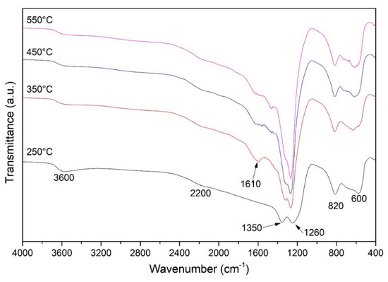 For the vibrational properties study, FT-IR spectrometry was employed, FT-IR spectra of the as-prepared and annealed zirconia thin films measured along the 400–4000 cm−1 range are presented in Figure 2. The FT-IR spectra were employed to check the formation of nanocrystalline zirconia in the tetragonal phases. The most vibrational bands observed in the spectra corresponds to bonds existing in ZrO2. The metal and oxygen bonds (Zr-O) are situated between 400 and 820 cm−1 [37,38,39]. The weak bands at 1260 cm−1 can be associated to carboxylate (COO-) groups [40]. Navio and coworkers reported that, for the ZrO2 tetragonal phase stabilization, the oxygen ion vacancy density needed may be originated only if carbonaceous material is present in the oxide lattice. In this manner, the stabilizization, to a high degree, of tetragonal ZrO2 structure is induced by carbon impurities [41,42]. The signal centered at 1350 cm−1 can be ascribed to stretching modes of terminal groups Zr-O– [43]. As per Bermúdez et al., the peak in the vicinity of 1610 cm−1 and the peak within the region, 1150–1350 cm−1 are characteristic of tetragonal ZrO2 [44]. Peaks of around 1610 cm–1 and 3600 cm−1 are attributed to the vibration modes of the –OH bond related hydroxyl groups [45,46], and the one at around 2200 cm–1 to CO2 [47]. These vibrational modes, come of OH from ambient, and CO2 from ambient and solution residual [48].