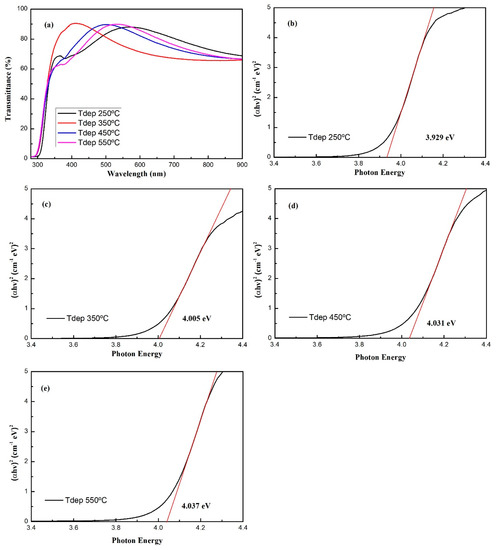 A wide distribution of light wavelength absorption is an important property should possess every good photocatalyzer [49]. The optical transmittance (To) spectra of the ZrO2 thin film deposited at 250 °C, 350 °C, 450 °C, and 550 °C are shown in Figure 3a. The thin films exhibit continuous transmittance across the UV-vis spectrum, with decreasing transmittance near the UV region. The ZrO2 films of this work showed a high transparency, with an average optical transmittance >70% in the 400–700 nm range, that enables them for transparent electronic applications, moreover, the absence of interference fringes indicates the films are thin, and the lack of multiple reflections at the air/film and film/substrate interfaces, facilitates a maximum transmittance of light through the films volume [50]. In addition, the presence of no fringes assures thickness uniformity. A shift of the transmittance curves toward the region of lower wavelength values is observed, which suggested a decrease of the thin films thickness, which supports the profilometer results on the increase of annealing temperature; moreover, different research groups have reported similar observations on other ZrO2 films [51,52,53,54]. This variation (wavelength shift) of the optical properties plays also as a basic requirement for a material that modifies its photocatalytic behavior. The direct optical bandgap was calculated using the Tauc’s method, data was plotted versus the photon energy , the extrapolation of the linear section of the curve to = 0, that is the energy axis, as observed in Figure 3b-e, provides the Eg value. Here, α is the optical absorbance coefficient (α = [Log(100/To)]/ [τLoge]). The all Eg values have been determined to be, 4.0 ± 0.1, that is, Eg has, within the error bar, practically the same value for all Tas. It is well known that a population of localized states intervenes as an important factor to alter sensitively the states into the band gap. This density is generally attributed to the presence of impurities, defects, and disorder into the material lattice, which, in turn, leads to the decreasing Eg. Nevertheless, the crystalline quality is, in general, improved with Tas, thus, it can enlarge the Eg value [55]. In our case, both effects can be compensated. The high Ta values help to reduce the density of defects and disorders in the material, so the density of the local states also decreases. The transmission peaks in the low wavelength region can arise (see Figure 3a), due to the valence band to conduction band transition [56]. However, these peaks in the transmission spectra are located at lower energy, as compared with the optical band gap 5.00 eV reported for bulk ZrO2 [57]. The result indicates that a considerable contribution from states exists, so that affects the transmission in that region. A large amount of surface defects can appear on the zirconia nanocrystals, due to their high surface/volume ratio [58,59]. It is worth noting that the Eg values obtained in our study are comparable with most of the ones reported in samples prepared by others processes [60,61,62], and have even more similarity with those reported for ZrO2 thin films prepared by Carević et al. (4.10 eV) [63] and Vaizoğullar (4.11 eV) [64].