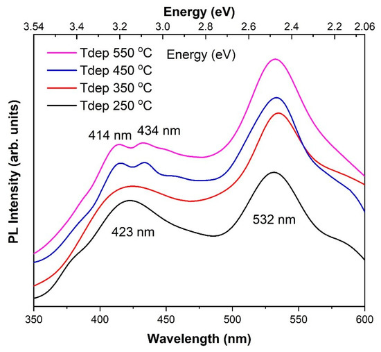 The photoluminescence (PL) technique is one of the most used optical methods for the semiconductor analysis. It has a powerful and sensitive ability to find presence of impurities, exciton fine structure, and defects, which commonly affect the material quality. Hih purity ZrO2 shows, in general, several broad emission-bands, which depend on the preparation techniques and excitation energy [65]. ZrO2 thin films of 250 °C and 350 °C mainly present two emission signals: one centered at 423 nm (2.93 eV) and the other at 532 nm (2.33 eV). For the 450 °C and 550 °C samples, three emission bands are present: one centered at 414 nm (3 eV), 434 nm (2.86 eV), and 532 nm (2.33 eV). The observed photoluminescence in ZrO2 films is probably due to non-stoichiometric material because an oxygen deficiency, originated by oxygen vacancies, formed when ZrO2 is synthesized [66]. Most peaks present in the PL spectra are transitions involving defects, which are after modified due to different Tas. therefore, an evident variation of the PL bands intensity for the different films is expected. A representative fluorescence spectrum excited with a wavelength of 325 nm and measured at RT, shown in Figure 4, exhibits four emission PL bands. The PL peak at 414 nm has been associated to Zr4+ vacancies, which is one of most intense peaks considered to be originated from emissions of free-exciton recombination at near band edge (NBE) [67]. Liang et al. [68] have reported that large amounts of surface defects should exist on the as-synthesized ZrO2 crystallites, because of the relatively high surface area. In the case of the emission at around 423 nm, it has been assigned to electron transitions from F-centers excited states to the ground state [69]. This emission can be compared with the 425 nm (2.92 eV) PL emission band in Zr1-xMnxO2 prepared by chemical synthesis and associated to oxygen vacancies, as reported previously by Pattanaik et al. [70]. Selvam et al. reported that oxygen-vacancies present in the lattice of ZrO2 nanocrystals are responsible for that PL emission [46]. The blue band at 434 nm is originated by singly ionized two-oxygen-vacancy (F–F)+ defects [71]. The peak at 532 nm could be ascribed to the emission from NBE transitions [65]. In the case of the complete emission band, transitions from all the mid-gap trap states are involved, such as surface defects and oxygen vacancies (Ov), grain boundaries [72].