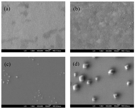 The micrographs were recorded using an accelerating voltage of 1.0 kV with a ×50,000 magnification. The micrographs of ZrO2 thin films were recorded in samples with the different Ta values studied. Figure 5a shows a sample which mostly presents a flat surface, is highly homogeneous, and has no cracks, and also looks somewhat spongy, with some surface imperfections like dark spots, which probably are a product of polycondensation (sol/gel) and/or densification cases. In Figure 5b, the film looks something dense without any cracks, scales, or pores. In addition, some bulges and pits irregularly distributed on the surface were observed [73]. It is believed that this fact is related to the crystallization of the thin film and with the formation of ZrO2. For the samples annealing at 450 °C and 550 °C (Figure 5c,d), it can be observed that both thin films are polycrystalline. Figure 5c shows that the thin film has a high homogeneity on the surface, with some nanocrystals with the size dispersed in the 30–60 nm interval. In addition, these nanocrystals are distributed non-uniformly and discontinuously on the surface of the ZrO2 sample, as shown in Figure 5d. The size of nanocrystals can increase up to ~ 100–150 nm, because they gradually agglomerate, giving place to a particle whose size augments as the annealing temperature increases. The shapes and sizes of these nanocrystal are found to depend on the annealing temperature. It can be observed that these shapes gradually transform from nanocrystal shapeless at 450 °C, until exhibiting tetragonal morphology at 550 °C [74].