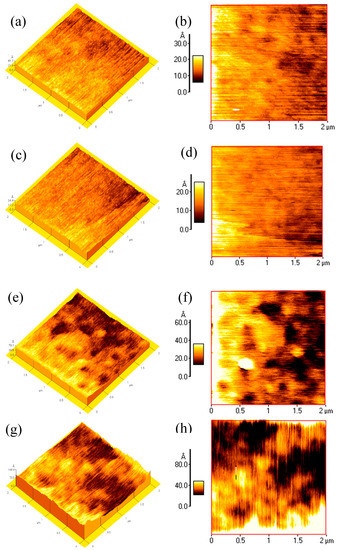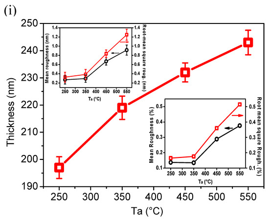 In order to further investigate the effect of the annealing temperature on the surface appearance of the ZrO2 thin films, a quantitative method for examining the morphology and structure is obtained, studying the roughness of AFM surface measurements. Figure 6a,c,e,g shows three-dimensional AFM images where the surface morphology can be appreciated. Figure 6b,d,f,h shows the roughness taken over 2 μm × 2 μm area of the surface coatings. The thin film roughness after the treatment at different Tas, determined by the AFM analysis, can be seen in Figure 6i. Figure 6i shows the thickness versus Ta plot. The mean roughness (MR), and root mean square roughness (RMSR), which represent the arithmetic average of the deviations from the median plane, are displayed in the upper inset. Area measure of the surface imperfections. Our results show a small increase in roughness after thermal annealing. As shown in Figure 6a, the surface roughness of the as-grown ZrO2 thin film is 0.312 nm, the increase in roughness after thermal annealing can be explained by the grain growth, the sintering process and some structure densification of the films [75,76].