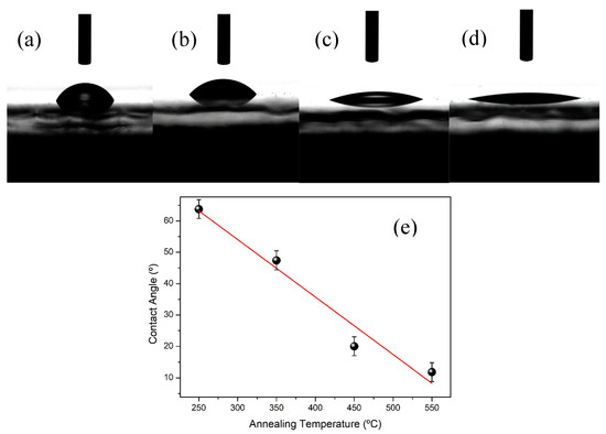 Provided the drop volume is considered as a very small one, the gravity effect may not be taken into account as compared with the liquid surface tension, and the spherical assumption is enough valid with little random error [79]. The water drops volume for this work was set to be ~5 µL. As shown in Figure 7a–d, the hydrophilicity of film for Ta = 550 °C is better than for 250 °C, 350 °C, and 450 °C. According to theory, CA is drastically influenced by the surface tension [80]. Figure 7e shows that the CA versus Ta plot for the four thin films studied describes a high linear inverse relation. This fact can be, in part, attributed to the surface roughness, added to defects formed on the surface (oxygen vacancies) [81]. The modification of the surface by thermal treatments influences the wettability of the samples, as shown in Figure 7.