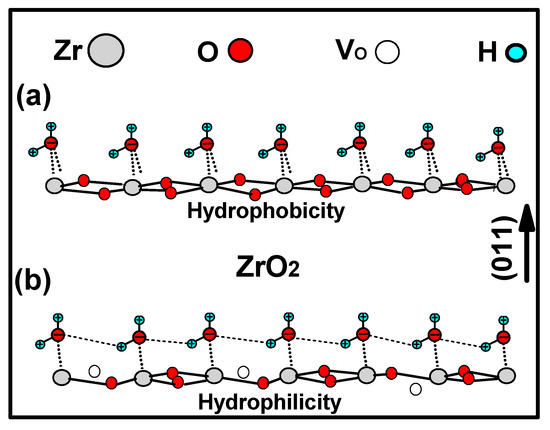 The effect of annealing on most oxides is to provoque oxygen vacancies (Ov), whose density increases in a larger degree at the surface when Ta increases, where ZrO2 is one of them [82]. The Ov influences, besides the roughness factor, the wettability properties of solid surfaces [81]. Some existent theories on the hydrophilicity contain an admissible explanation on the wettability of a liquid on a hydrophylic surface, which, for this work, should be considered in relation to the polar character of the H2O molecule, because here, the effect of the surface charged defects (vacancies, impurities, etc) on the dipolar charge O2−-2H+ intervenes, that is, the dipolar charge of H2O moleculeis affected by the lack of electrical neutrality of surface. In Figure 8, a schematic image [83] of the ZrO2 (011) tetragonal surface (the films present high preferred orientation along the (011) direction) with H2O molecules, is represented in the case of (a) the hydrophobic character with no Ov on the surface, and (b) with Ov generated by the annealing.