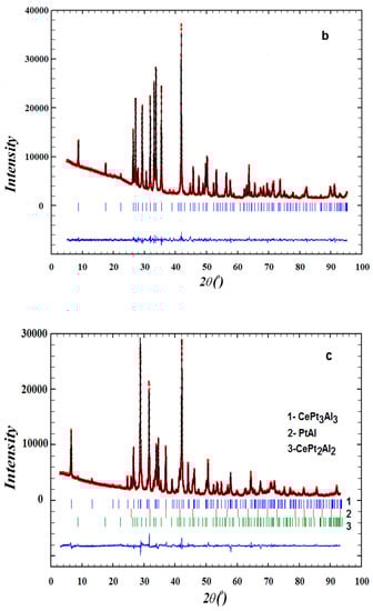 The crystal structures of the tetragonal and orthorhombic modifications of CePt2Al2 as well as CePt3Al3 were determined from experimental powder XRD data. Indexing of the powder XRD pattern was performed using TREOR and DICVOL programs implemented in WinXpow [] and FULLPROFF [,] packages.