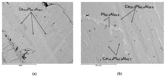 Microstructures of all samples are shown in Figure S1 in the Supplementary Materials. Microstructure of the Ce14.2Pt42.9Al42.9 (at.%) alloy annealed at 700 °C showed that, in addition, to the main Ce14.4Pt42.9Al42.7 (at.%) phase, the sample contained Pt50.2Al49.8 (at.%) and Ce20.0Pt40.4Al39.6 (at.%) as admixtures (Figure 2b).