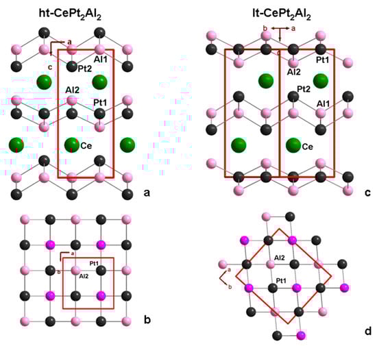 High-temperature modification of CePt2Al2 is a new representative of tetragonal CaBe2Ge2 type (space group P4/nmm, Pearson symbol tP10) with lattice parameters: a = 4.3637(9) Å, c = 10.0925(14) Å, and Z = 2 (Figure 1a). The lt-CePt2Al2 compound crystallizes with its own structure type (space group Cmme, Z = 4): a = 5.84138(2) Å, b = 6.39099(3) Å, c = 10.11611(5) Å (Figure 1b).