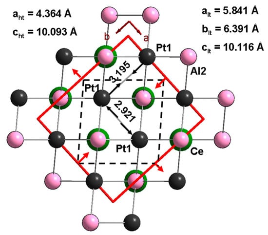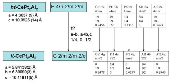 The observed phase transition can be attributed to a second-order transition. The space group of lt-CePt2Al2 (Cmme) is a subgroup of ht-CePt2Al2 (P4/nmm). The main relationship in Bärnighausen formalism [,] is presented in Figure 5.