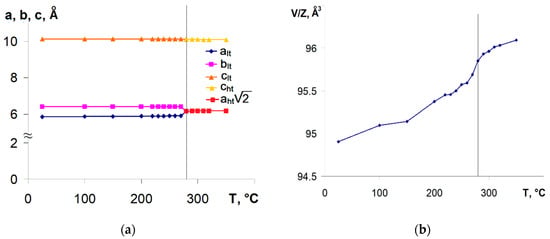 The phase transition is of a displacive nature. Both modifications have a common structural motif and the same local atomic environment. On heating lt-CePt2Al2, Pt and Al atoms slightly shift in the directions indicated by the arrows in Figure 6, which leads to the equalization of the Pt1–Pt1, Al1–Al1, Ce–Pt2, and Ce–Al2 interatomic distances and of parameters a and b, and consequently, to transition from an orthorhombic to a tetragonal unit cell (Figure 7a, Table 3). There is no appreciable volume reduction in phase transformation. The formula unit volume increases continuously when heating from 25 °C to 350 °C with a negligible jump at the transition temperature (Figure 7b).