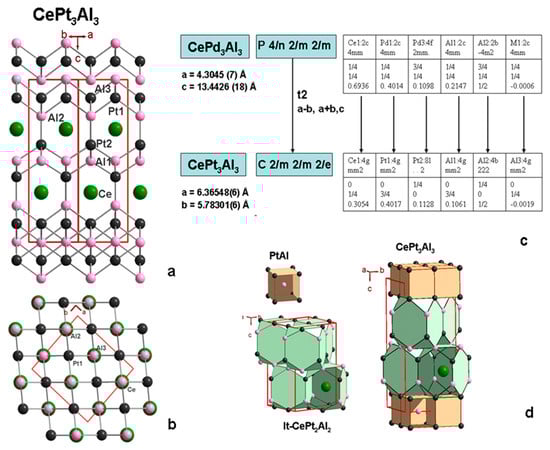Crystal structure of CePt3Al3, with projection in [110] (a) and projection along the c-axis (b). Unit cells are outlined in red. Group–subgroup relations in the structures of CePt3Al3 and CePd3Al3 (c). Homologous series of CePtnAln (n = 2, 3) (d).