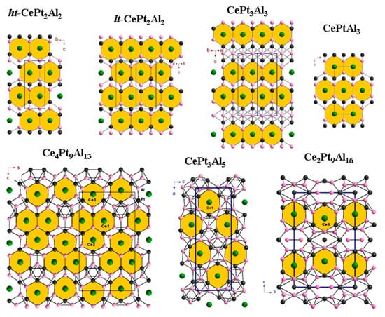 The crystal structures analyzed consist of three-dimensional networks of Pt and Al forming Ce-centered hexagonal prisms of alternating Pt and Al atoms at the vertices, which were also observed in the structures of cerium platinum aluminides with high Al content: CePtAl3 [], CePt3Al5 [], Ce4Pt9Al13 [], and Ce2Pt9Al16 [] (Figure 9). In these structures, one of the unit cell parameters is about 4.2 Å, which corresponds to the height of the Ce-hexagonal prism. In the structures of ht-CePt2Al2, lt-CePt2Al2, and CePt3Al3 as well as in CePtAl3, there are two-dimensional layers of condensed Ce-centered hexagonal prisms, in contrast to the infinite isolated single channels of hexagonal prisms in CePt3Al5 and Ce2Pt9Al16, and combinations of single and condensed triple channels of hexagonal prisms in the Ce4Pt9Al13 compound (Figure 9).
