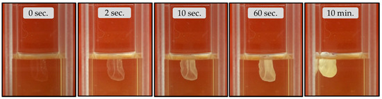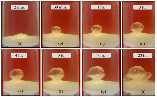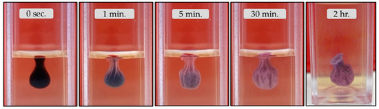 Barium vesicles were synthesized by placing drops of saturated barium chloride solution on Magadi water in a half-filled cuvette. Figure 6 and Video S10 show the growth process of Ba vesicles. Figure 6 is a sequence of frames taken from Video S10 (in Supplementary Materials). Upon the interaction of the Ba solution with the Magadi water, barium vesicles immediately precipitate at the interface between the drop and the Magadi water. Consequently, the transparency of the drop changes to white within about a minute. The vesicles remain hanging on the upper part of the water. Later on, these vesicles sink to the bottom of the reservoir (Figure 7a).