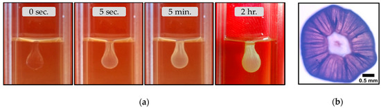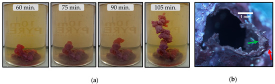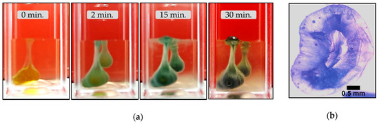(a) Temporal evolution of morphology and texture of the calcium mineral vesicles (width of the cuvette is 1.25 cm); (b) hollow calcium vesicle with its opening.