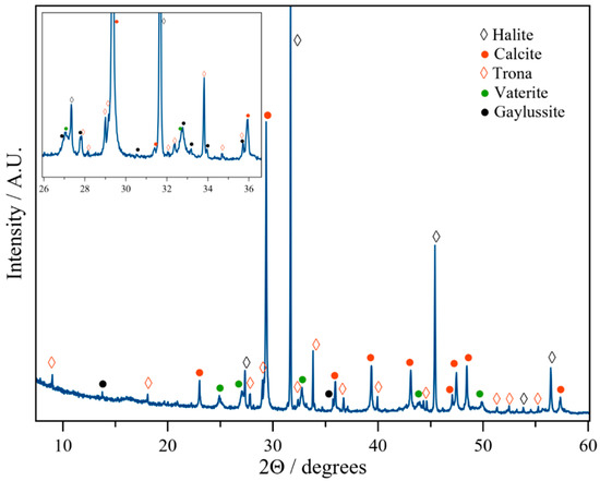 After washing with distilled water and alcohol, vesicles are dried and powdered for X-ray diffraction. The X-ray diffraction shows halite, calcite, trona, vaterite and gaylussite phases (Figure 4). Raman spectra acquired on vesicle fragments after cleaning with a similar protocol confirmed only calcite (Figure S3). The bands at 153 and 280 cm−1 are translational and librational modes (lattice modes) of CO32− respectively. The bands at 712 and 1085.3 cm−1 are assigned to in-plane bending and symmetric stretching (internal modes) of CO32− group respectively [27,28]. Trona, vaterite and gaylussite did not appear in Raman spectra most likely because of low proportion. However, trona, gaylussite and vaterite were observed in SEM micrographs.