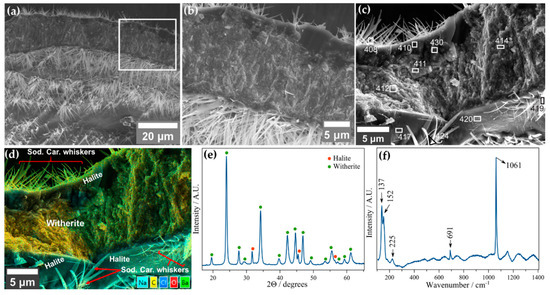 (a) Cross-section and the inner surface of Ba vesicle; (b) closer look of the cross-section marked by the white square in panel (a); (c) SEM micrograph of the membrane cross-section with rectangles where EDX analyses performed (see Figure S7 for EDX analyses); (d) EDX map of panel (c) showing witherite membrane with the inner and outer halite and sodium carbonate whiskers; (e) powder X-ray diffractogram of Ba vesicles; (f) Raman spectra of Ba vesicles (137, 152, 225 cm−1 —lattice modes; 691 cm−1 —symmetric bending mode; 1061 cm−1 —symmetric stretching mode).