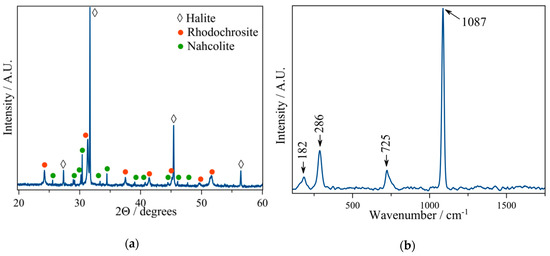 After washing with distilled water and alcohol, the vesicles are dried and powdered for X-ray diffraction. The X-ray diffraction shows halite, rhodochrosite, and nahcolite phases (Figure 10a). Raman spectra (Figure 10b) acquired on the vesicles after cleaning with a similar protocol confirmed rhodochrosite. Bands at 182 and 286 cm−1 are assigned to translational lattice modes whereas bands at 725 and 1087 cm−1 are in-plane bending and symmetric stretching modes of the carbonate groups respectively [30]. Nahcolite did not appear in Raman spectra.