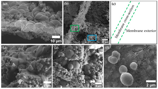 SEM images of manganese vesicles. (a) Cross-section of the membrane; (b) cross-section of the membrane and its exterior; (c) simplified sketch of panel (b); (d) closer look of the cross-section at the green rectangle in panel (b); (e) exterior of the membrane at the blue rectangle in panel (b); (f) interior wall of the membrane.