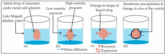 Mineral precipitation triggered by pouring drops of saturated metal salt solutions in Magadi water forms hollow vesicular membranes. The formation of these mineral vesicles follows a general process that is schematically shown in Figure 16. Once the lighter metal salt drop is poured on top of the Magadi brine, the drop remains hanging on the uppermost layer of the water by a combination of buoyancy and surface tension. The shape of the liquid drop, which is controlled by its density, is maintained for the first few seconds to few minutes (Figure 16a), depending on the onset of mineral precipitation in the interface of the metal salt drops with the surrounding Magadi water. A good example of density control over the shape of the drops is observed in Ca vesicles (Figure 3a). Initially, the liquid drop has a transparent bulb-like shape (Figure 3a at 0 min.). Water diffusion (Figure 16b) by osmosis slowly dilutes the concentration of the drop and lowers its density relative to the initial drop at 0 min. Consequently, the bottom of the drop moves upward by buoyancy effect while expanding horizontally outward, and forms a spherical transparent drop (Figure 3a at 10 min. and Figure 16c). Later on, metal carbonate minerals precipitate at the interface, forming hollow vesicles (Figure 16d), which have an opening or mouth at their uppermost edge, i.e., at the place where the metal solution is in contact with the air. This opening eventually facilitates the escape to the atmosphere of the forming CO2 gas, thus avoiding the bursting of the membrane. The evolution over time of the shape and characteristic of the membranes depends very much of the precipitation rate, which is a function of the supersaturation of the mineral phases, and the rate of equilibration of the inner and outer regions of the vesicle, which is a function of the evolving chemical gradient between the salt solution inside the vesicle and the exterior Magadi water. The porosity and the rigidity of the forming mineral membrane allow different osmosis-driven inflows of water molecules from the alkaline water towards the metal solution inside the membrane (Figure 16d). For instance, the osmotic inflow of water and the resulting internal pressure causes the swelling of the vesicles. During swelling, the shape of the vesicles change from bulb-like to spherical membranes (Figure 16b–d). In quickly precipitating vesicles and rigid membranes, only the size of the membrane increases while retaining the initial bulb-like morphology. In Mg and Fe (II) vesicles, the rigidity of the membrane causes overflow of the interior salt solution via the mouth and precipitation of secondary vesicles upon the interaction of the overflowing interior metal solution with the exterior Magadi water (Figure 13a and Figure 15a). Finally, the combination of the buoyancy of the drop and osmotic diffusion of water forms floating, hollow bulb-like or spherical membranes with an opening at the upper edge.