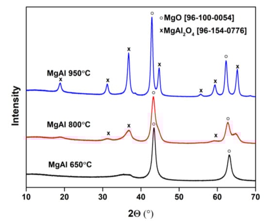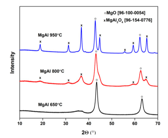 To study the reconstruction peculiarities of sol–gel derived Mg2−xMx/Al1 (M = Ca, Sr, Ba) layered double hydroxides (LDHs), the precursor gels were firstly annealed at 650 °C, 800 °C, and 950 °C for 4 h. The XRD patterns of mixed metal oxides (MMO) obtained by heating the Mg2/Al1 LDHs precursor gels at different temperatures are presented in Figure 1. The XRD pattern of the sample heated at 650 °C had two XRD peaks, which show the formation of a mixed metal oxide (MMO) phase with an MgO-like structure (JCPDS No. 96-100-0054) [14]. Thermal treatment of the precursor gels at 800 °C resulted in the formation of two phases, namely MMO and a low-crystallinity spinel phase with the composition of MgAl2O4 (JCPDS No. 96-154-0776). After heating at 950 °C, evidently, the highly crystalline MgAl2O4 phase has formed along with the MgO phase.