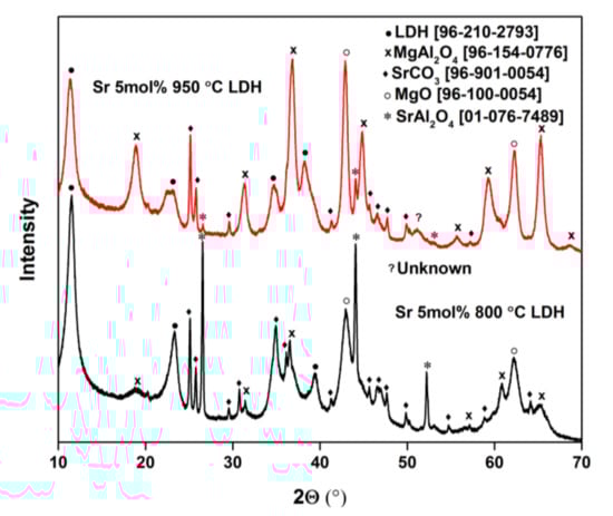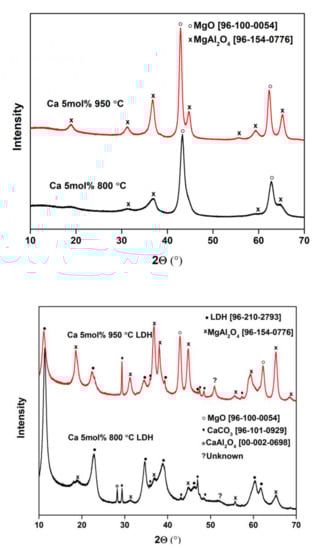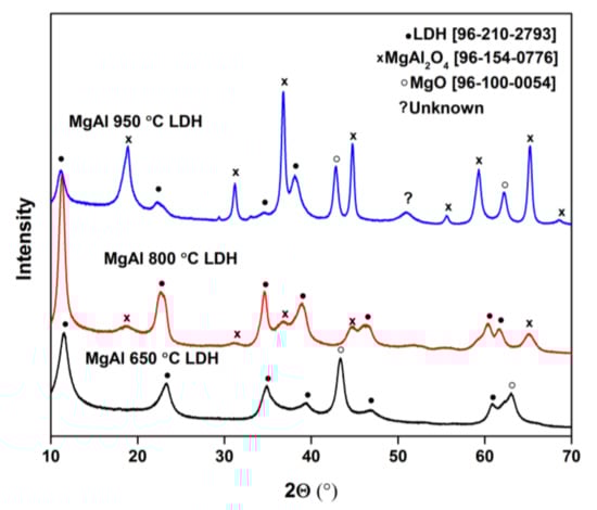 Three basal reflections typical of an LDH structure were observed: at 2θ of about 10° (003), 23° (006), and 35° (009) [14,15]. Besides, the spinel phase obtained at 800 °C and 950 °C remain almost unchanged during the reconstruction process. These results are in good agreement with those previously published elsewhere [38].