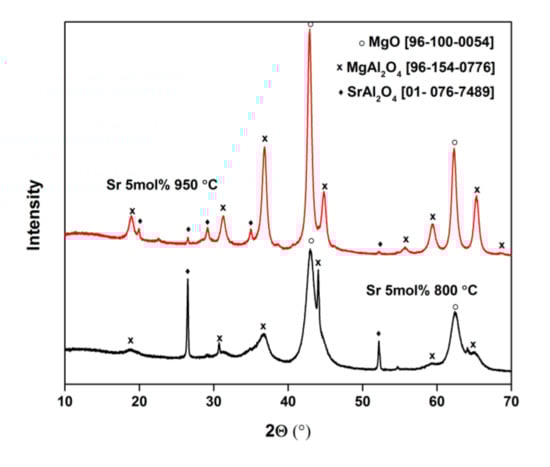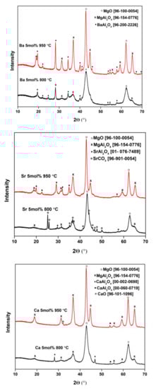 The XRD patterns of synthesis products with the same substitutional level of Ca, Sr, and Ba obtained at 800 °C and 950 °C are almost identical and revealed in all cases with the formation of crystalline magnesium oxide, magnesium spinel phase MgAl2O4 and an appropriate spinel of alkaline earth metal (CaAl2O4, SrAl2O4 and BaAl2O4). Again, during the partial reconstruction process, the phase purity of sol–gel derived Mg2−xMx/Al1 LDHs evidently is dependent on the nature of introduced metal. As was expected, the spinel phases obtained at 800 °C and 950 °C remained almost unchanged during the partial reconstruction process. Moreover, during the reconstruction process, a negligible amount of metal carbonates (CaCO3, SrCO3, and BaCO3) have formed as well. The XRD patterns of mixed metal oxides (MMO) obtained by heating the Mg2−xMx/Al1 (M = Ca, Sr, Ba) precursor gels at different temperatures and reconstructed LDHs are presented in Figure 3, Figure 4 and Figure 5, respectively. The XRD analysis results confirmed that the phase purity of alkaline earth substituted LDHs obtained by an indirect sol–gel synthesis approach is highly dependent on both the annealing temperature of the precursor gels and that of the alkaline earth metal.