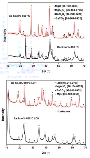 The obtained mixed metal LDH samples were repeatedly heated at different temperatures to obtain MMO and compare the phase composition, morphology, and surface properties with obtained ones after initial annealing. The XRD patterns of non-substituted and Ca, Sr, and Ba containing MMO obtained after the heating of LDHs are shown in Figure 6 and Figure 7, respectively. Evidently, the XRD patterns of mixed metal oxides (MMO) obtained by heating the Mg2/Al1 precursor gels (see Figure 1) and obtained by heating the Mg2/Al1 LDHs (Figure 6) are very similar, confirming the same phase composition. However, the reflections of just obtained MMO are more intense in comparison with ones presented in the repeatedly obtained MMO from LDHs. Obviously, the second time obtained Ca and Sr substituted MMO samples contain much more side phases (see Figure 3,Figure 4 and Figure 7). However, this is not the case for the Ba-substituted MMO samples. Both synthesis products obtained from precursor gels and by heating LDHs were composed of several crystalline phases.