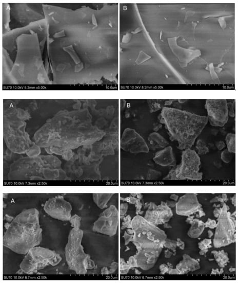 SEM micrographs of MMO obtained by heating the Mg1.95Sr0.05/Al1 precursor gels (top), sol–gel derived Mg1.95Sr0.05/Al1 LDHs (middle), and MMO obtained by heating the Mg1.95Sr0.05/Al1 LDHs (bottom). Annealing temperatures: 800 °C (A) and 950 °C (B).