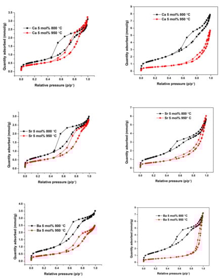 Thus, the isotherms and hystereses are dependent on both synthesis pathway and annealing temperature. The nitrogen adsorption–desorption results obtained for the mixed metal oxides containing Ca, Sr, and Ba (Figure 13) demonstrated that the N2 adsorption–desorption isotherms show very similar trends.