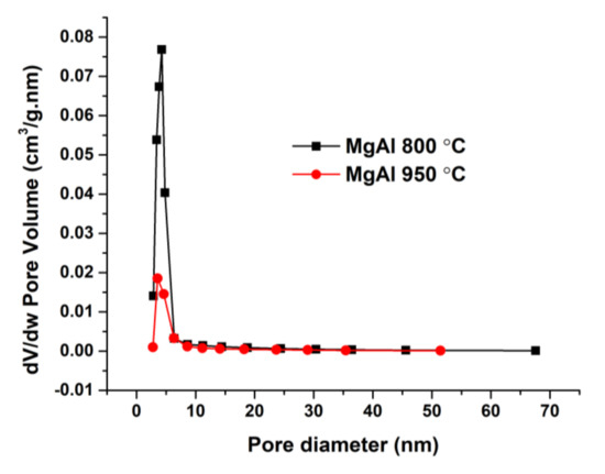 Figure 14 shows the pore size distributions obtained by the BJH method for the MMO specimens obtained by heating Mg–Al–O precursor gels and Mg2/Al1 LDHs. Both samples demonstrate narrow pore size distributions (PSD) almost at the mesoporous level, but very close to micropores domain.