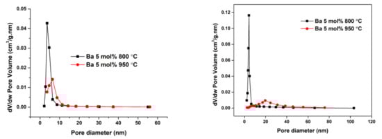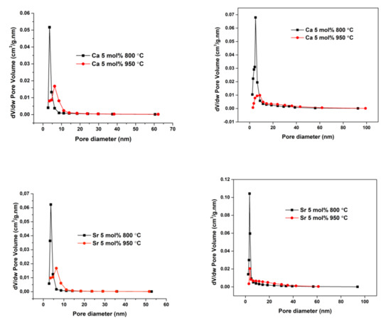 Surprisingly, the PSD width does not depend neither on the synthetic procedure nor on the annealing temperature. The determined average pore diameter in the mesopore region is approximately 3.0–5.5 nm. The PSD results obtained for the mixed metal oxides containing Ca, Sr, and Ba are shown in Figure 15.