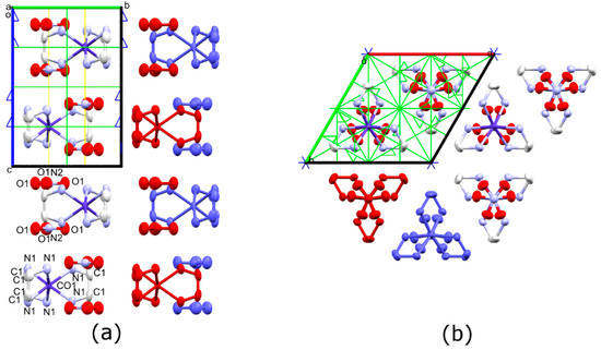 Magnetic susceptibility measurements were performed while using a MPMS-XL SQUID magnetometer (Quantum Design, San Diego, California, USA) on crushed single crystals of [Mn(en)3](NO3)2 (30.33 mg), [Co(en)3](NO3)2 (10.48 mg) and [Ni(en)3](NO3)2 (12.31 mg) introduced in a polyethylene bag (3 × 0.5 × 0.02 cm3). Movement of the cobalt crystallites was prevented by adding a small amount (4.78 mg) of Paratone oil to the sample due to the expected high anisotropy of the cobalt complex. Prior to the measurements, field dependent magnetization was measured at 100 K in order to detect bulk ferromagnetic impurities. The data were corrected for the diamagnetic contribution of the sample and the sample holder (and the oil for the Co(II) measurements). EPR was performed on a polycrystalline sample in a quartz tube on an EMX X-band (9.54 Gz) spectrometer (Bruker, Billerica, Massachusetts, USA) at 5 K while using a continuous-flow cryostat.
