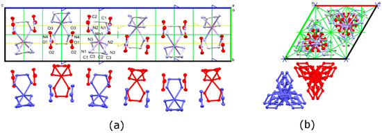 Anisotropic displacement ellipsoid diagram (Mercury, 50% probability) of Δ-[Co(en)3](NO3)2 at 298 K as viewed down the (a) a crystal axis and (b) c crystal axis. Unit cell and symmetry axes are shown, with blue = six-fold screw, yellow = three-fold and green = two-fold axes. Two different columns are indicated by red and blue molecules. Hydrogen atoms have been omitted for clarity.