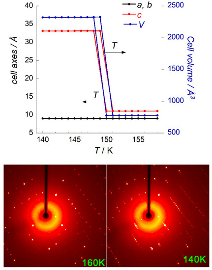 An examination of the appearance of Bragg peaks corresponding to the tripled cell close to the transition using 0.2 K temperature increments and a long exposition time suggests that the transition is not as abrupt as could be inferred from Figure 4. Indeed, Bragg peaks pertaining to the low temperature phase begin to appear as high as 152 K in cooling mode, and their intensity continues to increase at least down to 148 K. At 140 K, the peaks are still more intense, which means that the transition is not complete at 148 K. The Supplementary Materials provides further details and the plotted data (Figure S8).