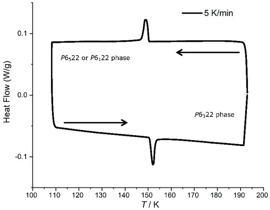 Differential scanning calorimetry (DSC) of [Mn(en)3](NO3)2 crystals was measured in order to confirm the transition temperature 149(2) K obtained by single-crystal X-ray measurements. The system was first equilibrated at 193 K, then cooled to 108 K, and then heated again to 193 K, at a rate of 5 K/min. The obtained DSC curve (Figure 5) displays an exothermic peak upon cooling centered at 149.0 K and an endothermic peak upon heating centered at 152.0 K. Thus, these results give an average phase transition temperature of [Mn(en)3](NO3)2 of 151(2) K, consistent with the crystallographic results. The integration of the exothermic and endothermic peaks gave identical results with ΔH = 277 J/mol, significantly higher than that reported for [Ni(en)3](NO3)2 (142 J/mol), as measured by DSC [7].