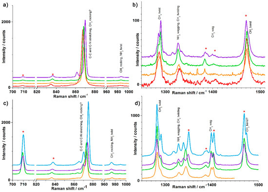 Raman spectra for (top) [Mn(en)3](NO3)2 at 298 (red), 200 (orange), 155 (green), and 140 K (light blue) in the (a) 700-720, 820-1000 cm−1 and (b) 1250–1510 cm−1 ranges and (bottom) [Zn(en)3](NO3)2 at 200 (orange), 155 (green), 135 (violet), and 100 K (blue) in the (c) 700–720, 820–1000 cm−1 and (d) 1250–1500 cm−1 ranges. The bands indicated with a red star are resonances supposed to be mainly due to NO3 in comparison to literature spectra.