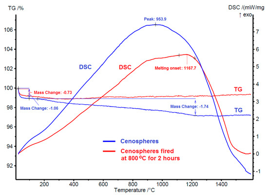 TG and DSC curves of cenospheres and fired cenospheres (800 °C for 2 h) samples.