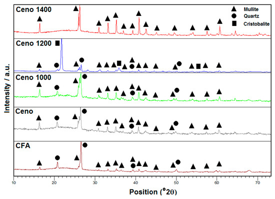 In order to validate the analysis results from the DSC curve, the cenospheres were heated at 1000, 1200 and 1400 °C for 2 h. A comparison of their X-ray diffractograms is shown in Figure 2. XRD analysis disclosed that the majority of crystalline phases present in the examined CFA and cenospheres were mullite and quartz. In both X-ray diffractograms, the glassy phase of amorphous silica and alumina was also detected along with the crystalline phases, as indicated by the broad characteristic diffraction peak between 17° and 30°, centered at a 2θ angle of 22.5° [12,13]. This amorphous glassy phase was originated from the un-crystallized aluminosilicate substance in coal.