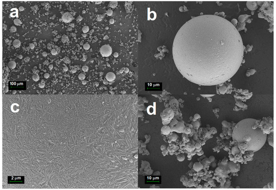 The micrographs in Figure 4 show that cenospheres heated at 1000 °C for 2 h still retained its perfect spherical appearance. However, it is noticed that a majority of the small cenospheres particles with diameters less than 10 µm were agglomerated after sintering (Figure 4d). It has been found that the chemical and phase mineral compositions of the cenospheres are related to the size of the cenospheres. Ngu et al. [16] reported that small cenospheres had a high SiO2/Al2O3 ratio compared to their larger counterparts. High SiO2/Al2O3 ratio and low mullite content are the main reason for smaller cenospheres having lower sintering temperature than the larger ones. It is also noticed that the mullite crystallites on the surface of the heated cenospheres (Figure 4c) were more prominent than the unheated cenospheres.
