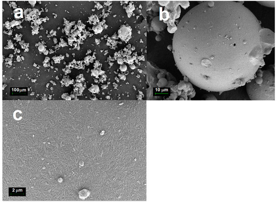 Table 2 shows the crystalline phase composition of CFA and cenosphere samples determined by Rietveld refinement of the diffractograms. According to the results, the cenospheres have a higher percentage of the mullite phase (7.1 wt.%) compared to CFA (4.0 wt.%), it can be concluded that the majority of the mullite crystallites were contained within the cenosphere structure. These results agree well with the FESEM micrographs of the cenosphere. Figure 3c,d shows the outer and inner surfaces of the cenosphere shell. The needle-shaped acicular mullite crystallites embedded in a glassy matrix can be seen on both surfaces of the cenosphere shell.