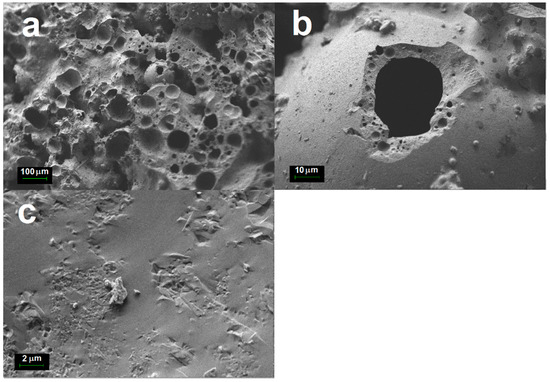 The morphologies of cenospheres heated at 1400 °C for 2 h are displayed in the FESEM micrographs of Figure 6. The micrographs showed that almost all cenospheres were fused together after sintering (Figure 6a). These structural changes were caused by the melting of crystalline silica in the cenosphere. Mullite crystallites on the surface of the heated cenospheres were also observed. However, the mullite crystallites were largely hidden by the melted glass phase as shown in Figure 6c.